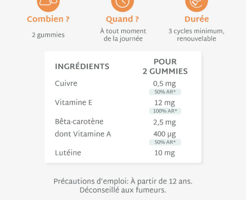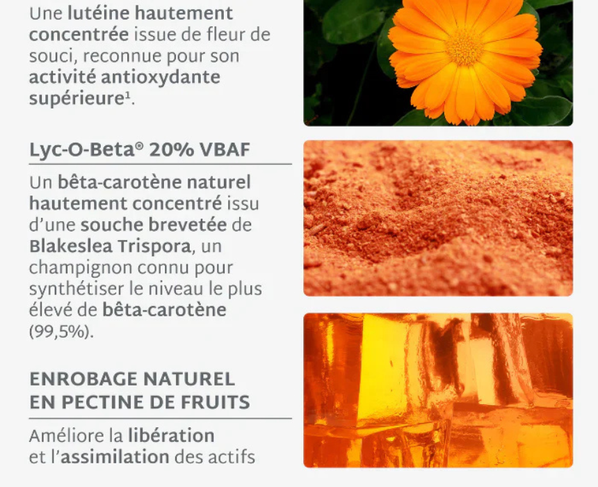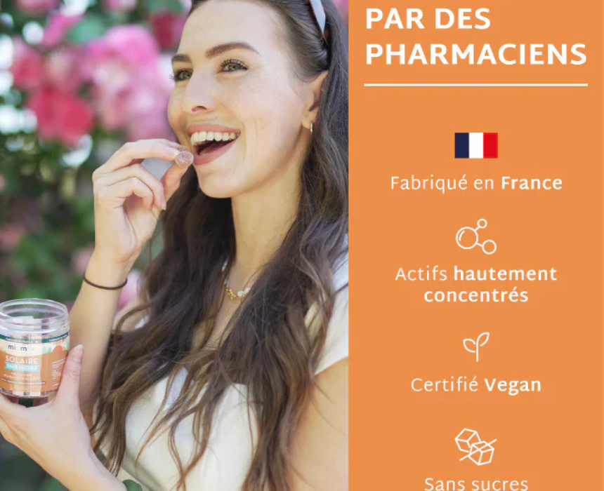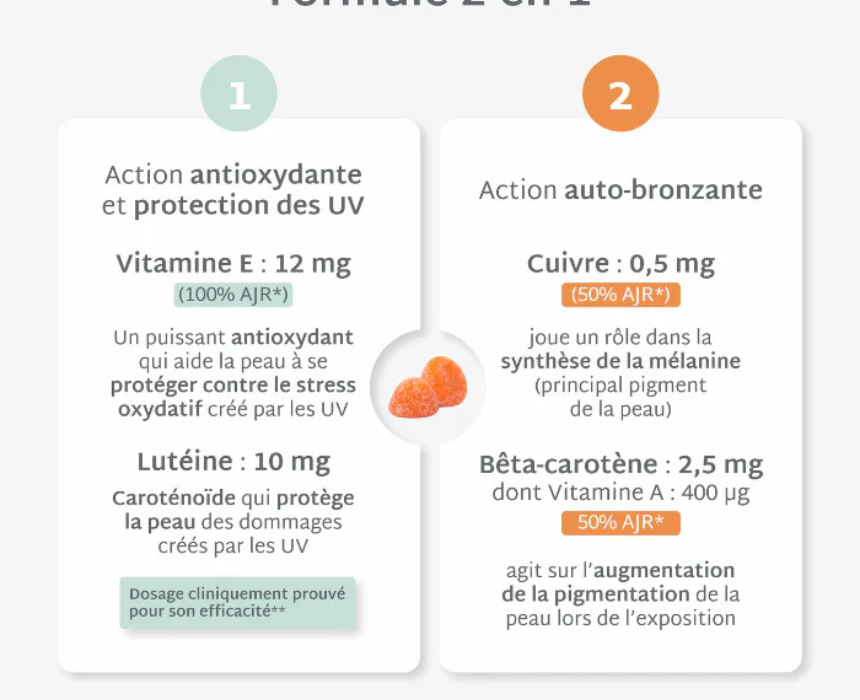 Solaire Gummies are formulated with patented beta-carotene, lutein, copper, and vitamin E to help prepare the skin for sun exposure, enhance natural tanning, and prolong a radiant, even complexion. They also help support skin health and protect against visible signs of premature aging linked to sun exposure. Designed for daily use, they can be easily integrated into a regular wellness routine for a healthy sun-kissed glow.