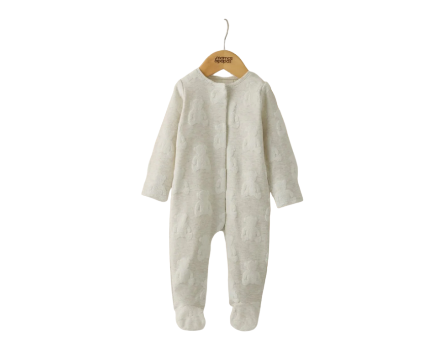 The Teddy Bear All In One in textured brown is a cosy and adorable unisex option for newborns, crafted from ultra-soft 100% cotton that’s gentle on delicate skin. Featuring a charming teddy bear print, integrated feet for warmth, turn-back scratch mitts, and a convenient zip fastening for easy dressing and nappy changes, it combines comfort with practicality. Perfect for layering or wearing alone, this all-in-one keeps babies snug, stylish, and ready for everyday wear.
