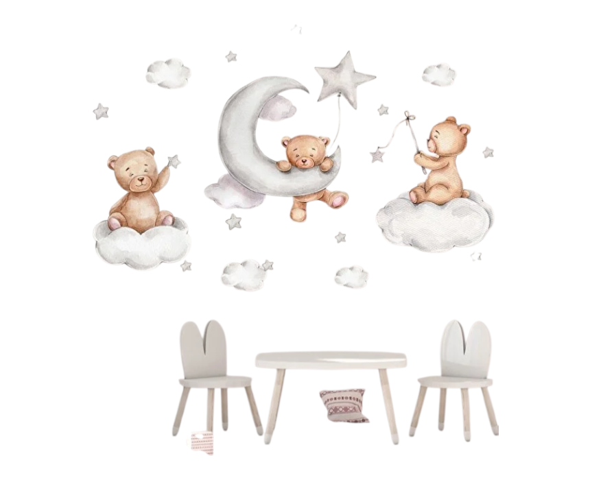 This teddy bears wall sticker set features playful designs of bears with stars, perfect for decorating kids bedrooms. The self-adhesive stickers can be easily applied to flat surfaces and are water-resistant, allowing for easy cleaning with a damp cloth. Ideal for adding a fun and whimsical touch to children’s rooms or play areas.