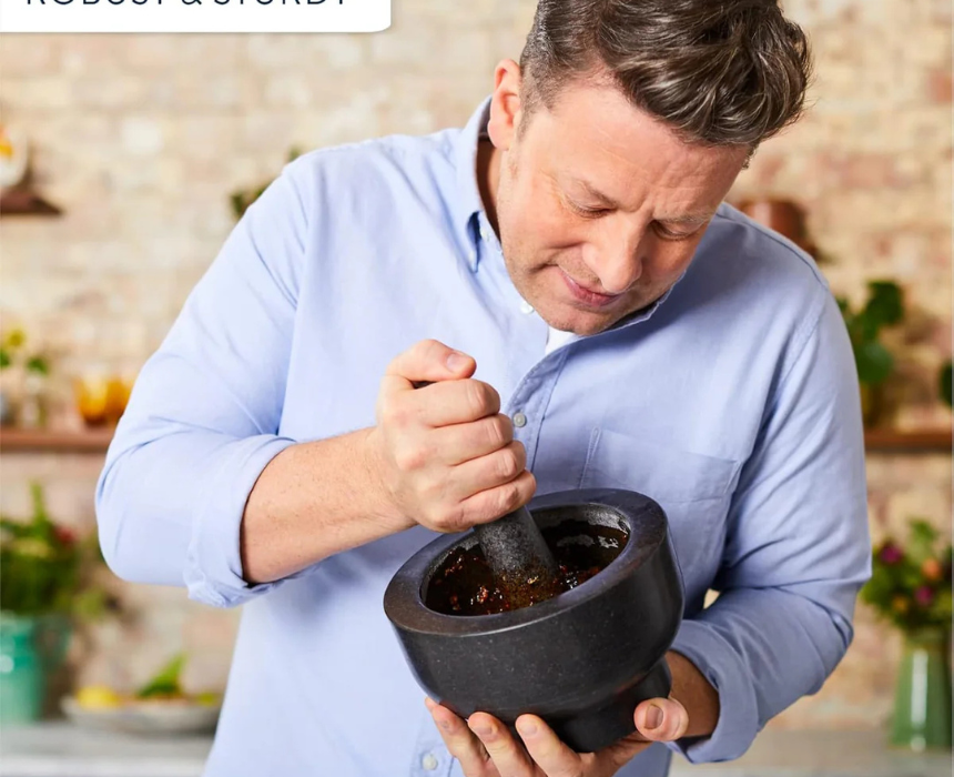 The Tefal Pestle & Mortar 20cm by Jamie Oliver is a durable kitchen tool designed for grinding herbs, spices, and seasonings with ease. Crafted for strength and style, it features a classic design that complements any kitchen countertop. Perfect for adding flavor to dishes, it allows effortless crushing, mixing, and preparing fresh ingredients.