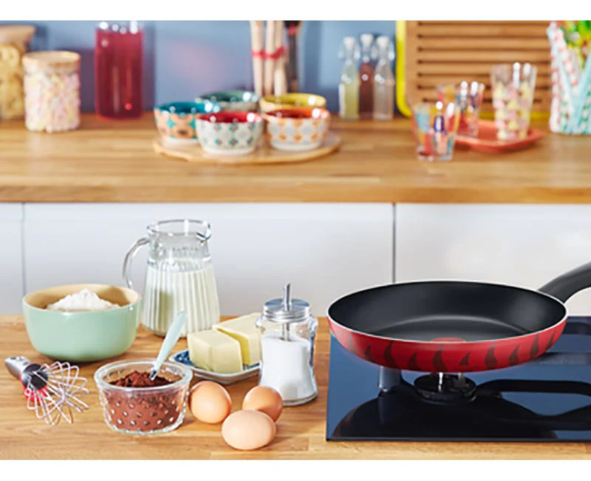 The Tefal Tempo Flame Frypan 24cm Non Stick Heat Indicator Daily Frying Pan in red offers even heat distribution for effortless frying and cooking. Its non stick surface ensures easy food release and quick cleaning, while the heat indicator signals the perfect cooking temperature. The vibrant red finish adds a stylish touch to any kitchen and makes everyday cooking both practical and visually appealing.
