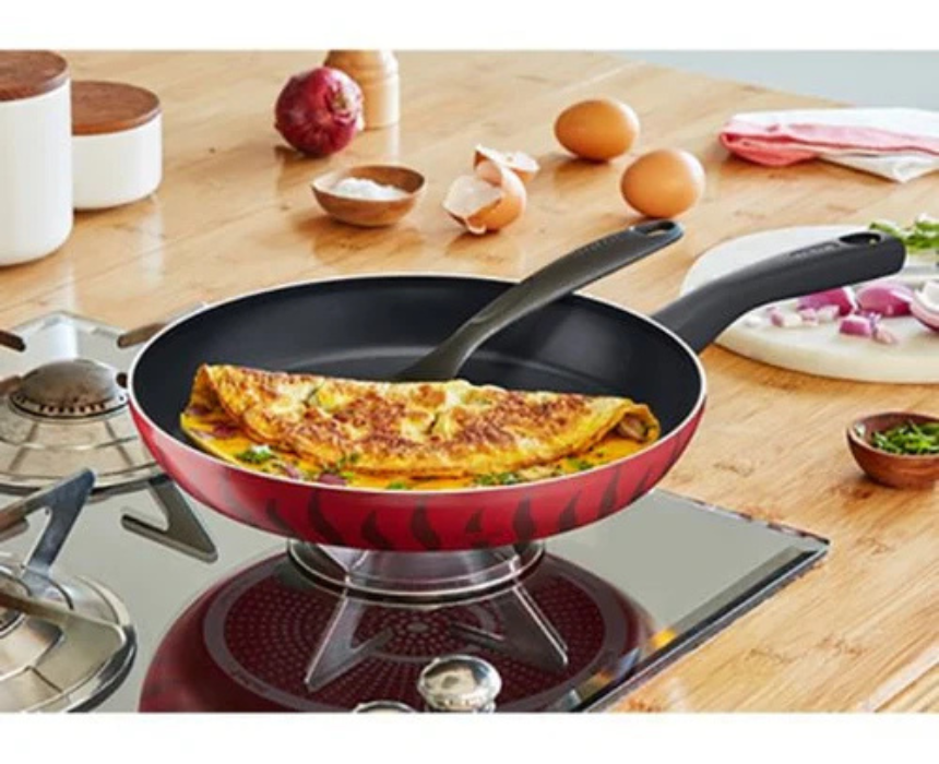 The Tefal Tempo Flame Frypan 28cm features a non-stick surface with a heat indicator for perfect daily frying of eggs, vegetables, and meats. Its durable construction ensures even heat distribution, while the vibrant red design adds a stylish touch to any kitchen. Lightweight and easy to handle, it is ideal for everyday cooking and effortless cleanup.