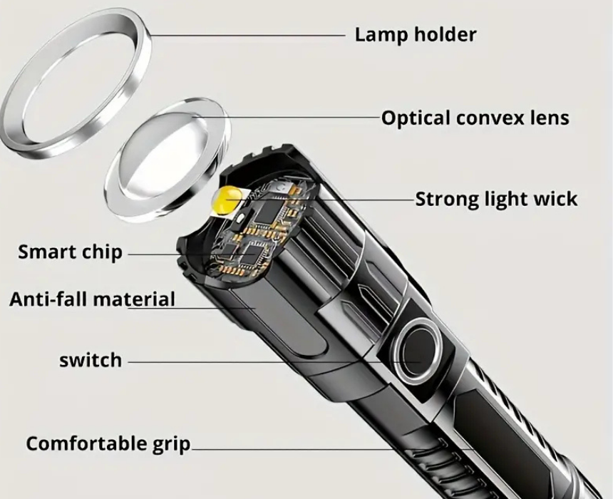 This telescopic zoom handheld emergency light features adjustable focus for wide-area illumination or precise spotlighting, delivering 150–350 lumens of bright LED light. Rechargeable via USB and built with durable ABS and metal materials, it provides a beam range of 200–500 meters for outdoor exploration, camping, work, or emergency situations. Compact and portable, it ensures reliable lighting wherever you go.