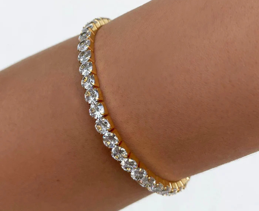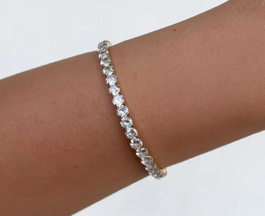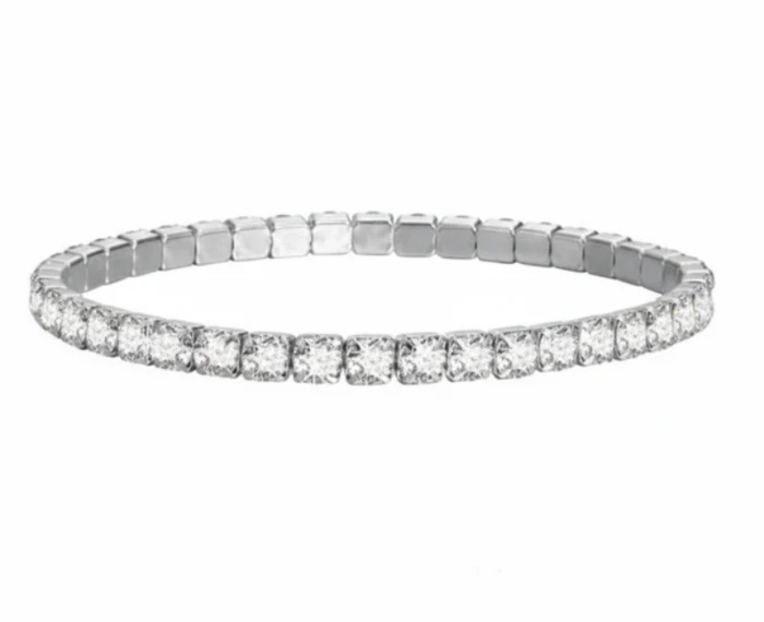Tennis Elastic Bracelet features a sleek line of sparkling stones set on a flexible elastic band, offering both elegance and ease of wear. Designed for comfort, it provides a secure fit that adapts to the wrist while maintaining a refined and polished appearance. Wear it alone for a classic statement or stack it with other bracelets to create a layered and sophisticated look suitable for everyday or special occasions.
