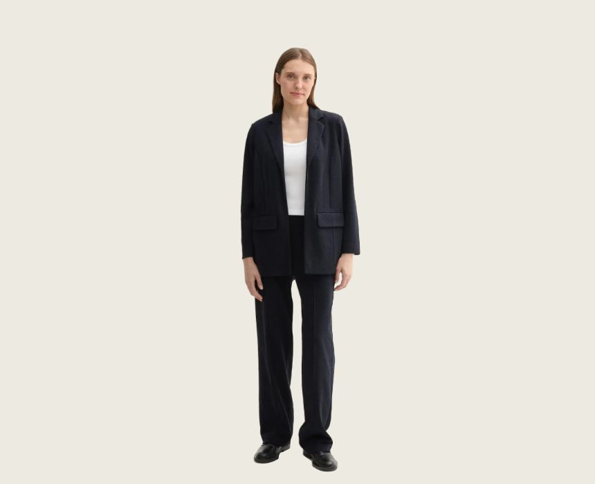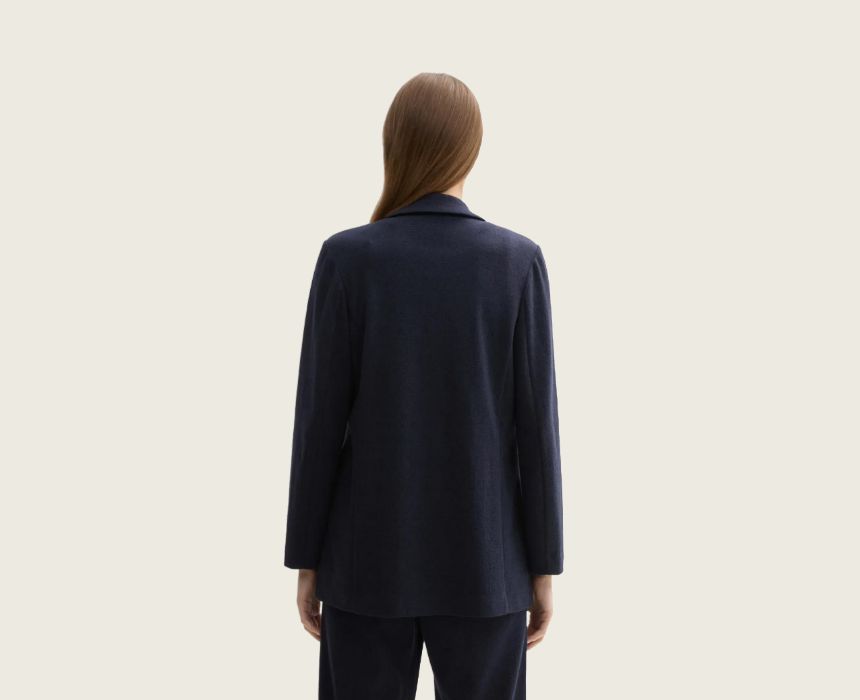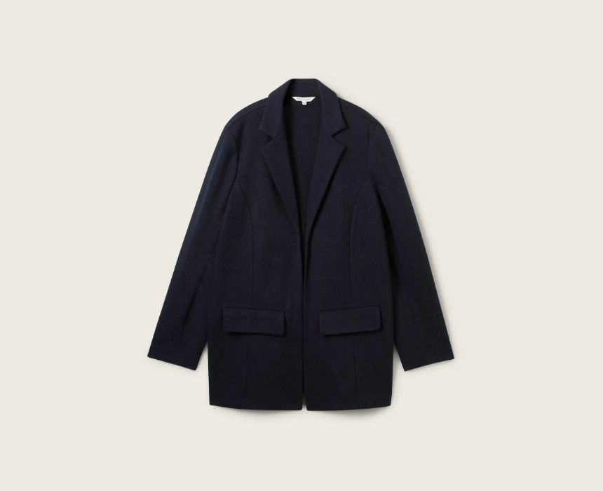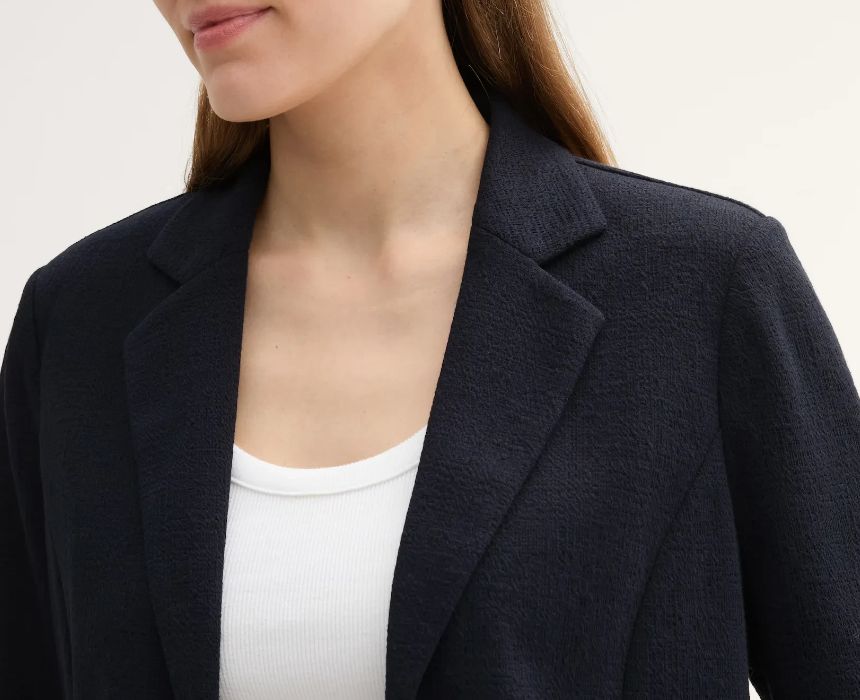 The Tom Tailor Textured Navy Blazer features a sleek open-front design with a lapel collar and stylish flap pockets. Its textured fabric adds a touch of sophistication, making it perfect for both business and casual settings. Pair it with tailored trousers for a polished look or with jeans for a smart-casual vibe.