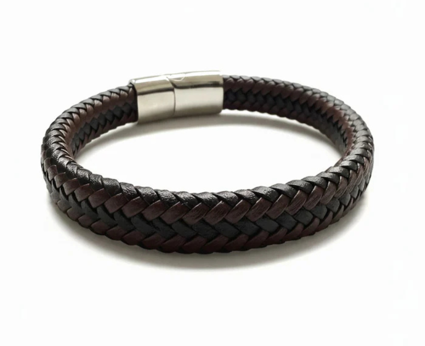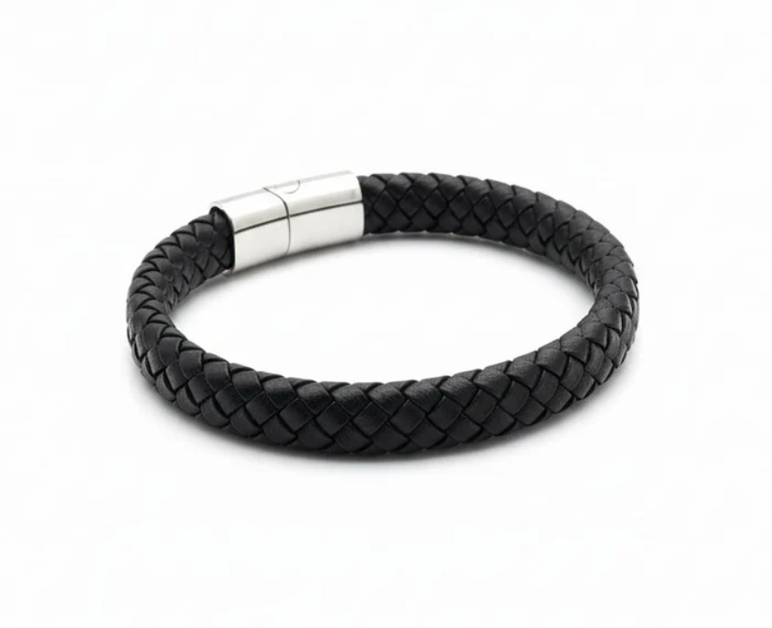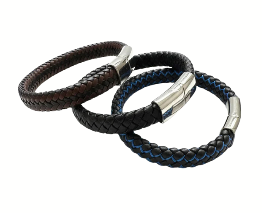 The alpha leather clip bracelet features a sleek combination of leather and a secure clip closure, creating a modern and masculine inspired accessory. It can be worn alone for a clean statement or paired with watches and other bracelets for a layered wrist style suitable for both casual and smart casual outfits. A versatile piece that adds a bold yet refined touch to everyday wear.