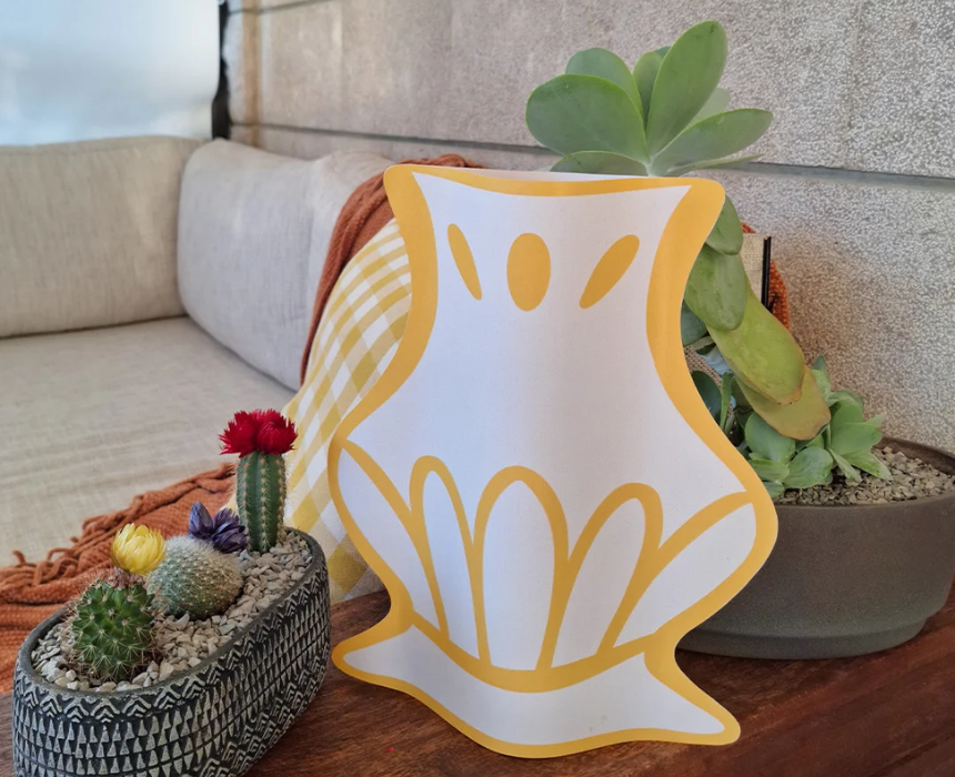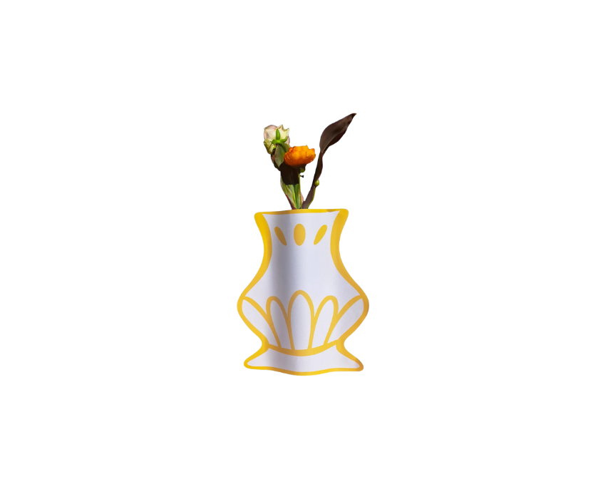 This timeless paper vase cover showcases a warm golden yellow pattern with flowing lines and a classic silhouette, adding understated elegance to any space. Printed on 160 gsm recycled paper, it comes with an empty glass bottle for instant display. Style it on a console table, shelf, or dining centerpiece with dried stems or fresh flowers for a refined decorative touch.