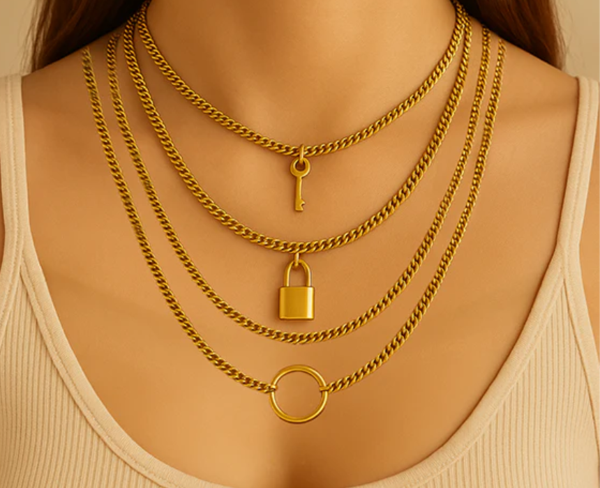 The Lock And Key Multi layered Necklace is crafted from 18K gold plated stainless steel, featuring symbolic lock and key charms arranged in a chic layered design that offers durability and long lasting shine. This versatile necklace adds a meaningful touch to everyday outfits and can be styled alone as a statement piece or layered with minimalist gold chains.