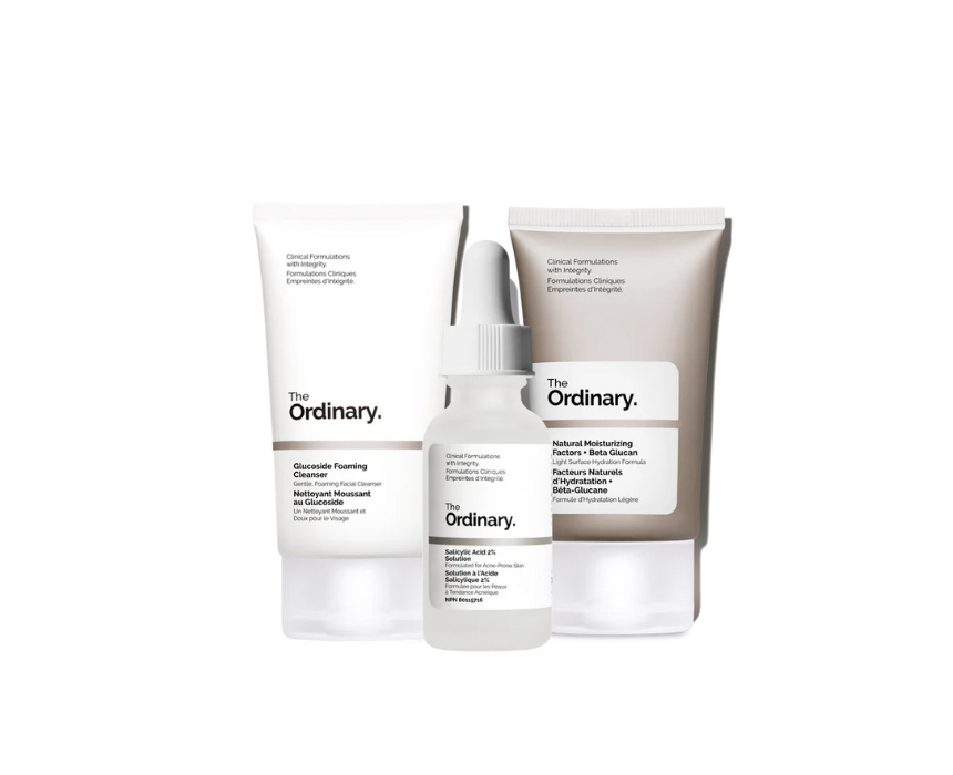 The Ordinary The Acne Set is a 3-step skincare regimen designed for acne-prone skin, combining gentle cleansing, targeted exfoliation, and lasting hydration. It includes the Glucoside Foaming Cleanser to remove impurities while respecting the skin barrier, Salicylic Acid 2% Solution to exfoliate and clear pores, and Natural Moisturizing Factors + Beta Glucan to hydrate and strengthen the skin. Used daily, it helps reduce breakouts, improve texture, and promote a clearer complexion.