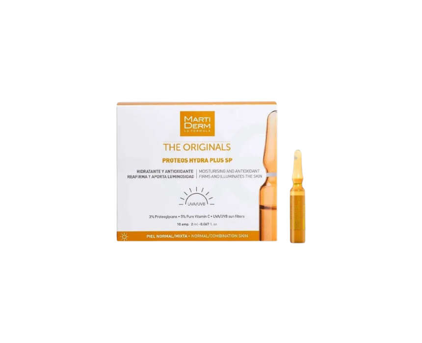 MartiDerm Proteos Hydra Plus Vitamin C ampoules provide intense hydration and firming benefits while brightening the skin and reducing the appearance of wrinkles. Enriched with proteoglycans and Vitamin C, they deliver antioxidant protection and improve skin suppleness. Apply half an ampoule daily to the face, neck, and décolleté, massaging gently until fully absorbed for a refreshed, radiant complexion.