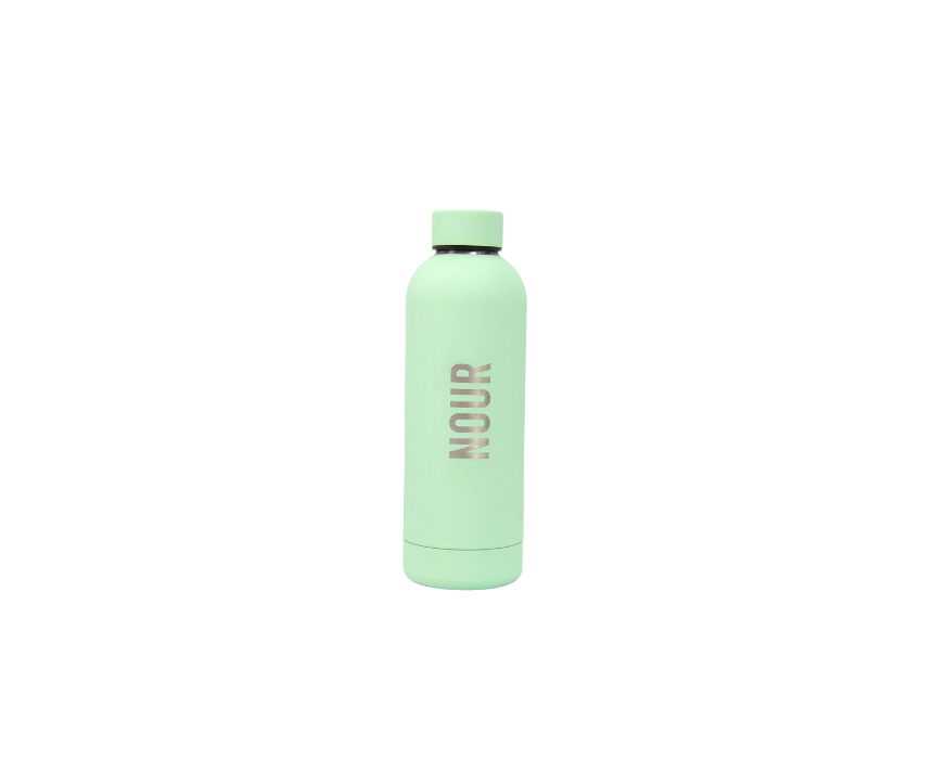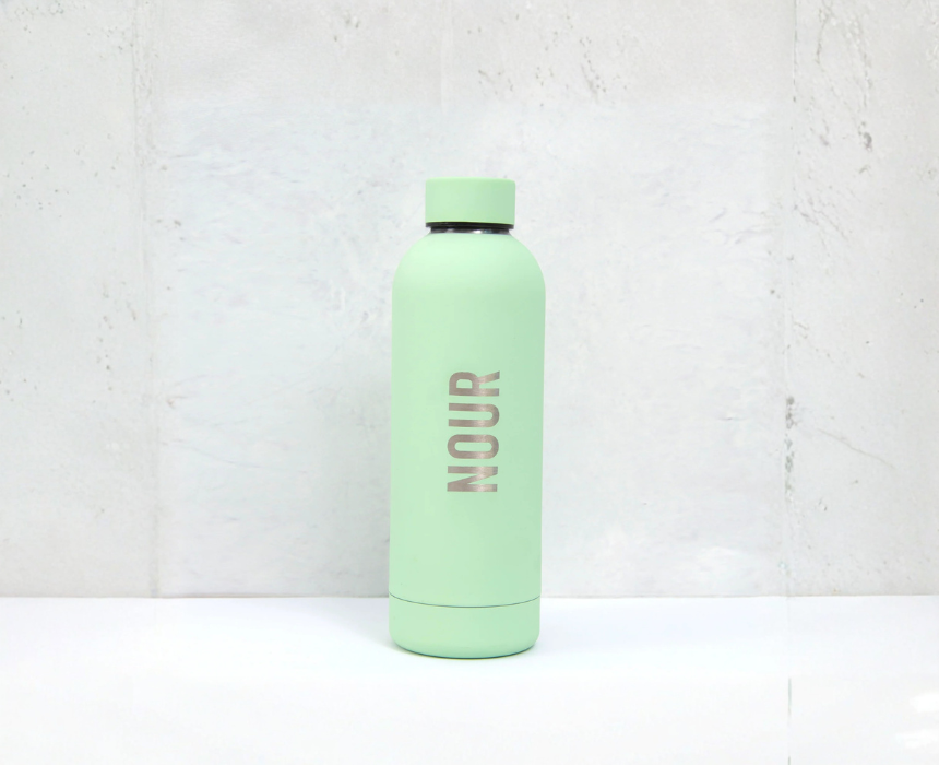 The Sip Bottle Mint is a refreshing and functional 500 ml stainless steel flask featuring double wall insulation to maintain your drinks at the ideal hot or cold temperature. This customizable bottle can be personalized with your name and offers a durable, leakproof design that is perfect for staying hydrated throughout a busy day. To style this pastel accessory, pair it with light grey activewear for a clean gym aesthetic or place it on a wooden workspace to add a calming and modern pop of color to your desk setup.