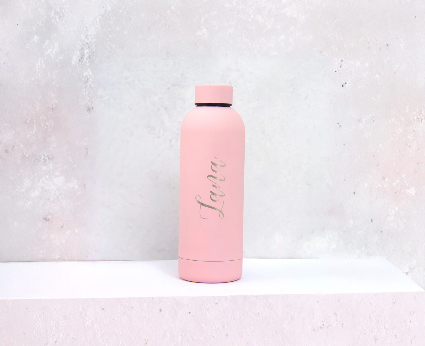 The Sip Bottle Pink is a vibrant 500 ml stainless steel water bottle featuring high performance double wall insulation to keep your beverages perfectly hot or cold all day long. This durable flask can be customized with your name and offers a sleek, leakproof design that makes it an essential companion for work, school, or travel. To style this chic accessory, carry it alongside a floral tote bag for a feminine touch or keep it in your car cup holder as a bright and personalized statement piece for your daily commute.