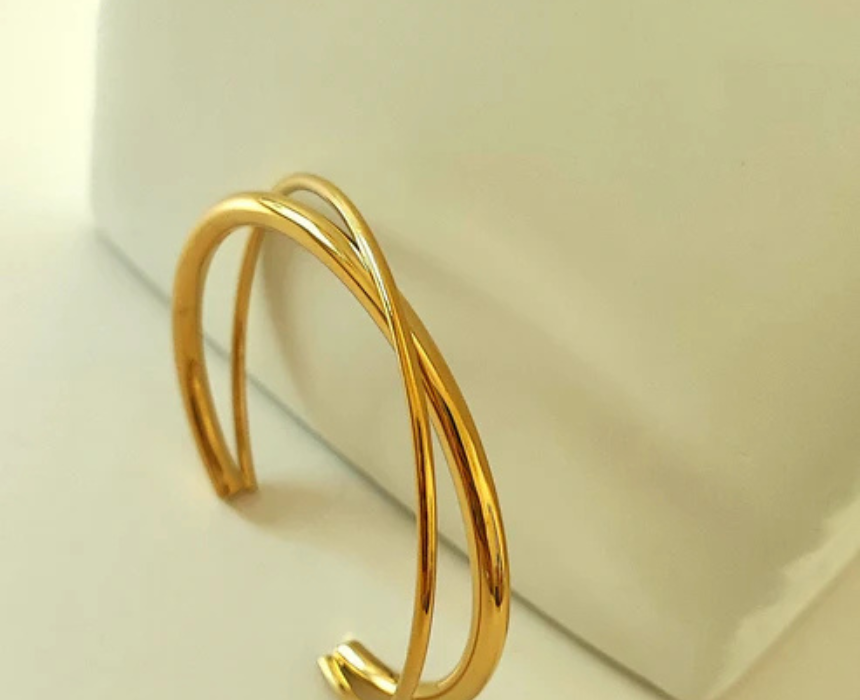 The Twisted Bangle is crafted from 18K gold plated stainless steel, featuring an elegant twisted design that offers durability, long lasting shine, and comfortable everyday wear. This timeless bangle complements both casual and formal looks and can be worn alone for a minimalist touch or stacked with other gold bracelets.