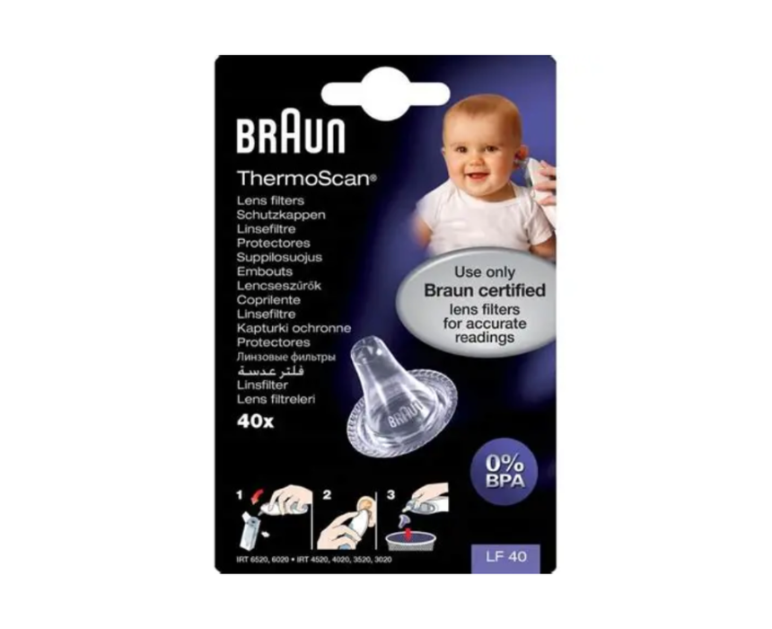 Braun ThermoScan disposable lens filters ensure hygienic and precise temperature readings by covering the thermometer probe to prevent contamination. Designed for single use, they help maintain accuracy by avoiding earwax or debris buildup while minimizing the spread of germs, making them safe for family use. Made from BPA-free and latex-free materials, these filters are gentle and compatible with all Braun ThermoScan ear thermometer models.