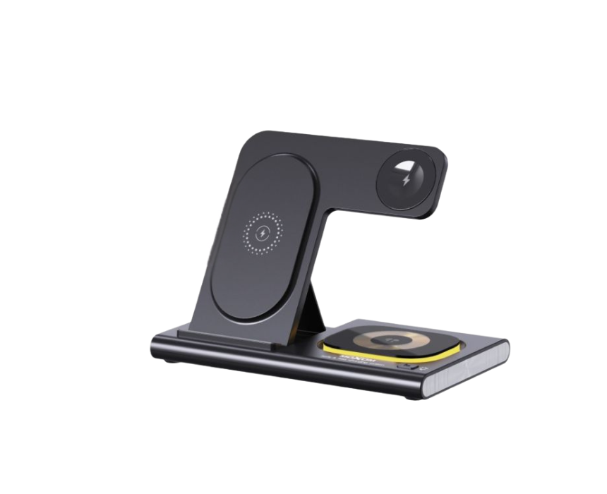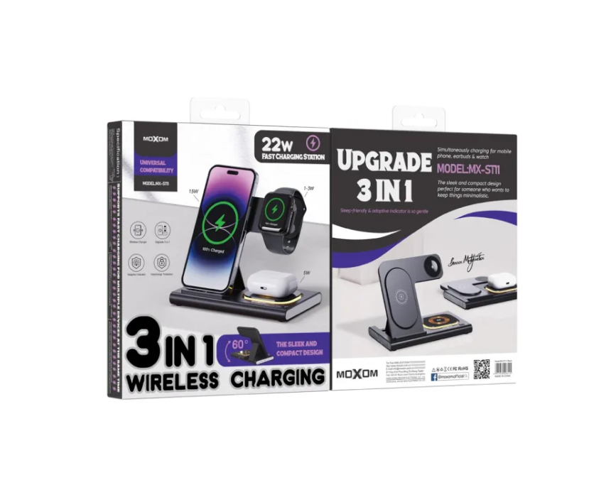 The MOXOM 3-in-1 Wireless Charging Dock delivers fast and efficient 22W power, designed to charge your smartphone, smartwatch, and earbuds all at once. With its stable base, smart heat-control system, and sleek modern build, it keeps your devices powered safely and neatly in one place. Perfect for desks, nightstands, and travel, it offers true convenience with clutter-free charging and universal compatibility with all major wireless-charging devices.