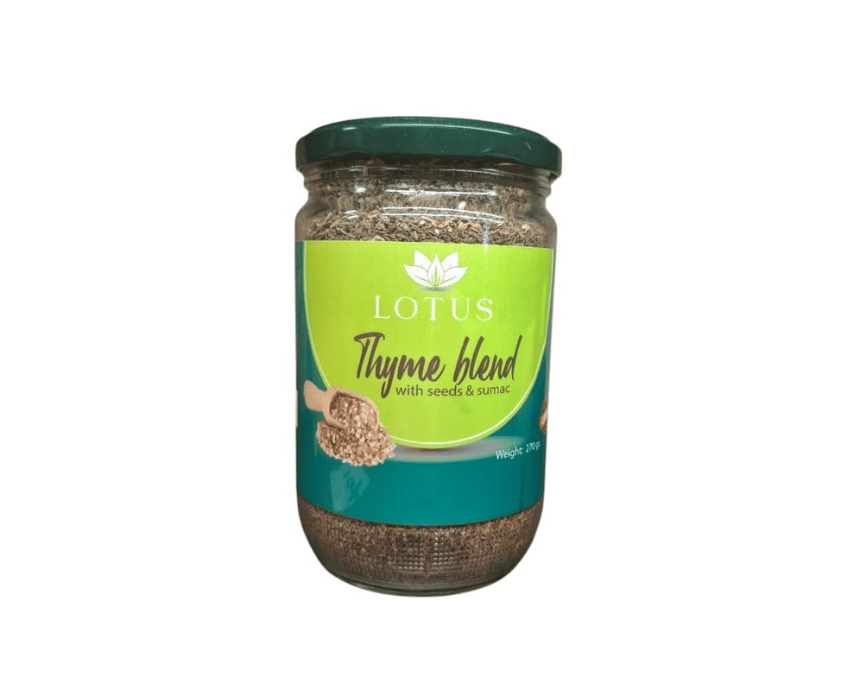 Thyme blend made from thyme leaves, sumac, Himalayan salt, pumpkin seeds, sunflower seeds, and sesame seeds, rich in dietary fiber, vitamins (B-complex, A, C), minerals, and antioxidants.
