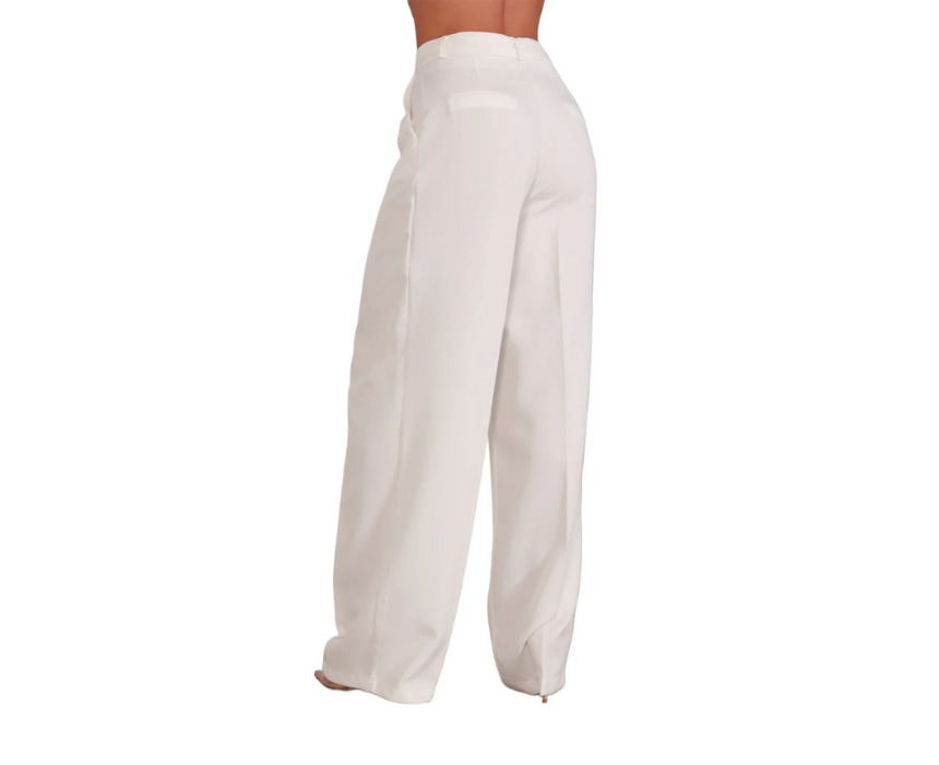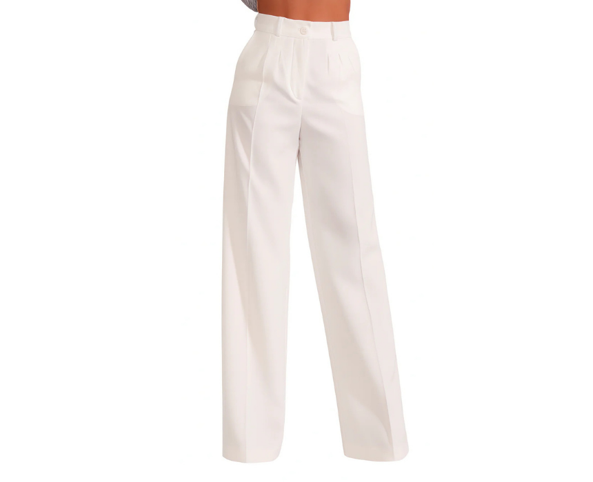 The Timeless Classic Trouser is a high-waisted white trouser crafted from a soft, stretchy blend of polyester, viscose, and lycra, offering both comfort and style. Perfect for smart-casual outfits, pair it with blouses, shirts, or tailored tops for a polished, versatile look. Fabric care includes machine wash at 30°C, professional dry clean, low-heat ironing, no bleaching, and do not tumble dry.