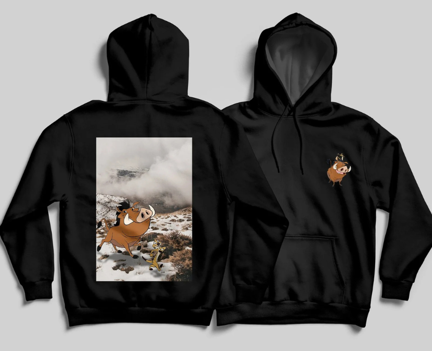 The Timon & Pumba X Lebanon Hoodie features a soft, comfortable fabric with a roomy hood and front pouch pocket, showcasing a playful design inspired by Timon, Pumbaa, and Lebanese pride. Its relaxed fit pairs easily with jeans, joggers, or layered outfits, making it ideal for casual wear, street style, or adding a fun, nostalgic touch to everyday looks.