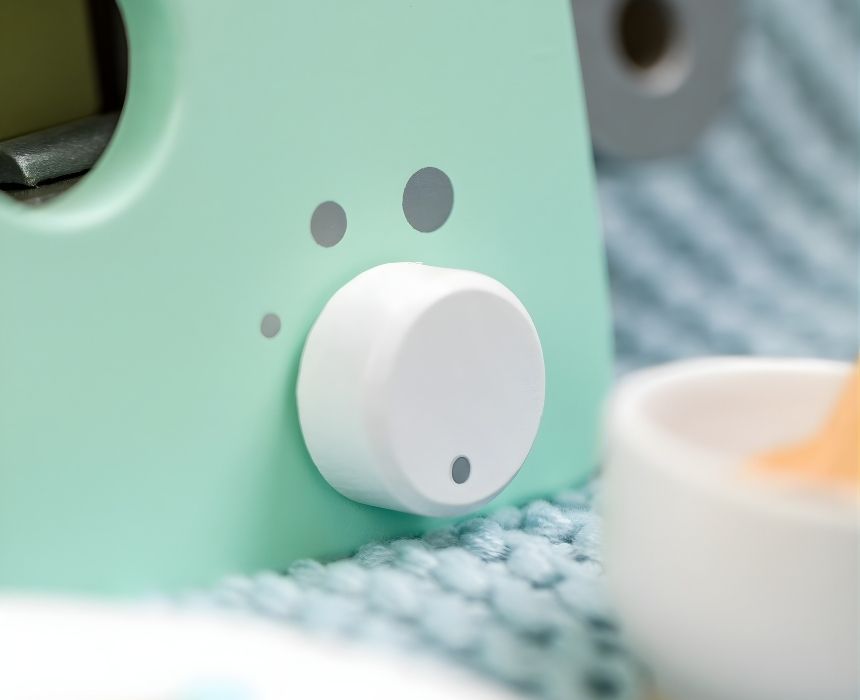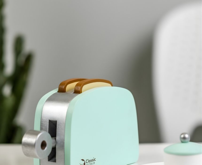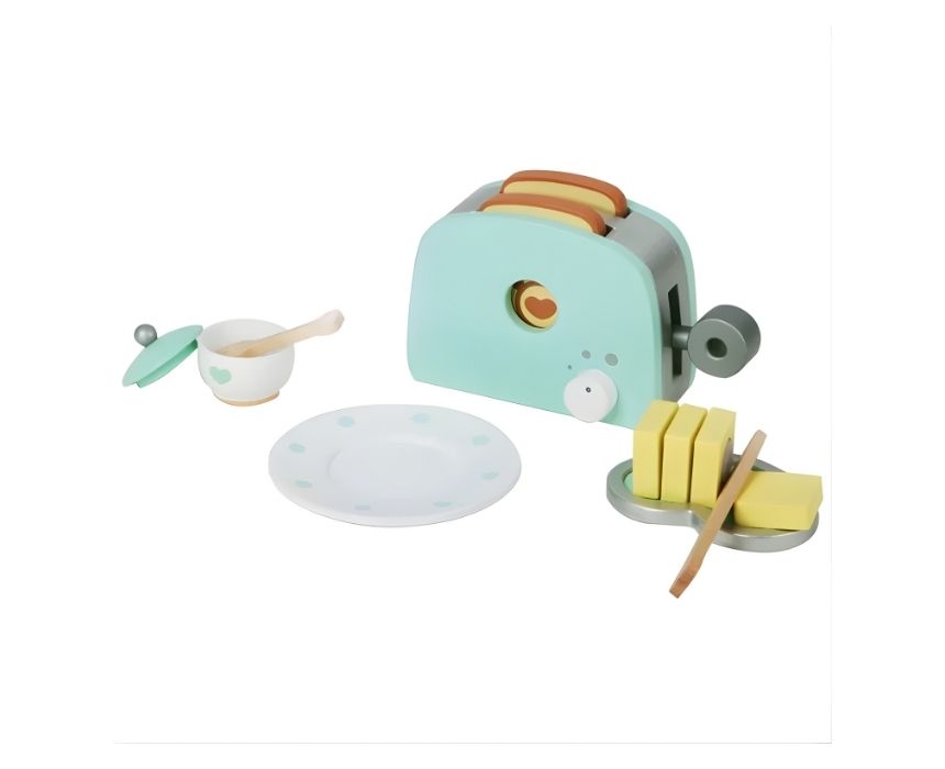 Make breakfast the most important meal of the day with this charming wooden Toaster Set. Designed to promote imagination, it encourages imitative and imaginary play for little chefs. The comprehensive set includes a toaster, toast, butter with a matching dish, plates, a wooden play knife, a spoon, and even a yogurt. Crafted for durability and safe handling, it helps children develop social skills while they “prepare” a healthy meal. A must-have for any play kitchen. Suitable for ages 3+.