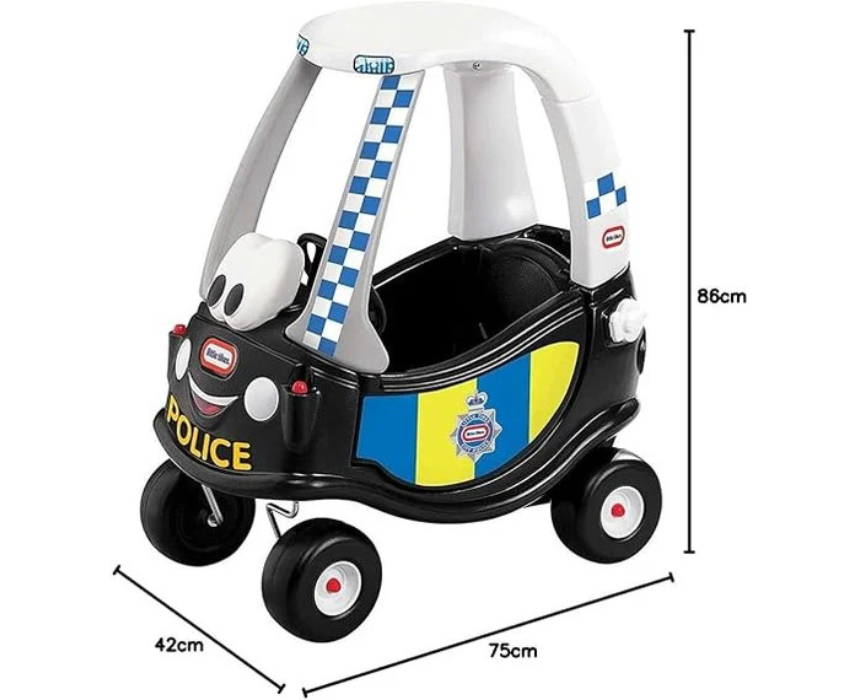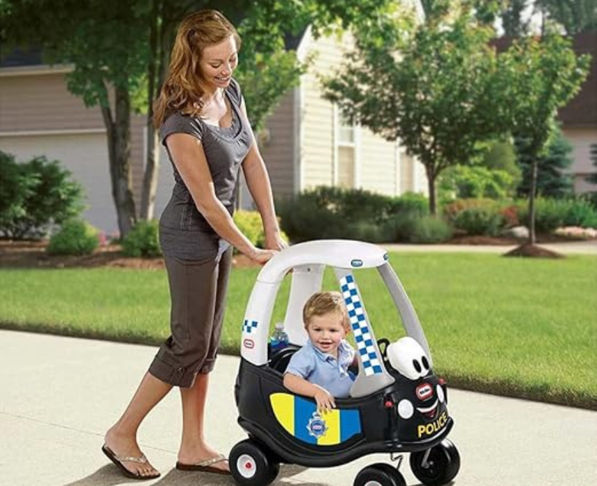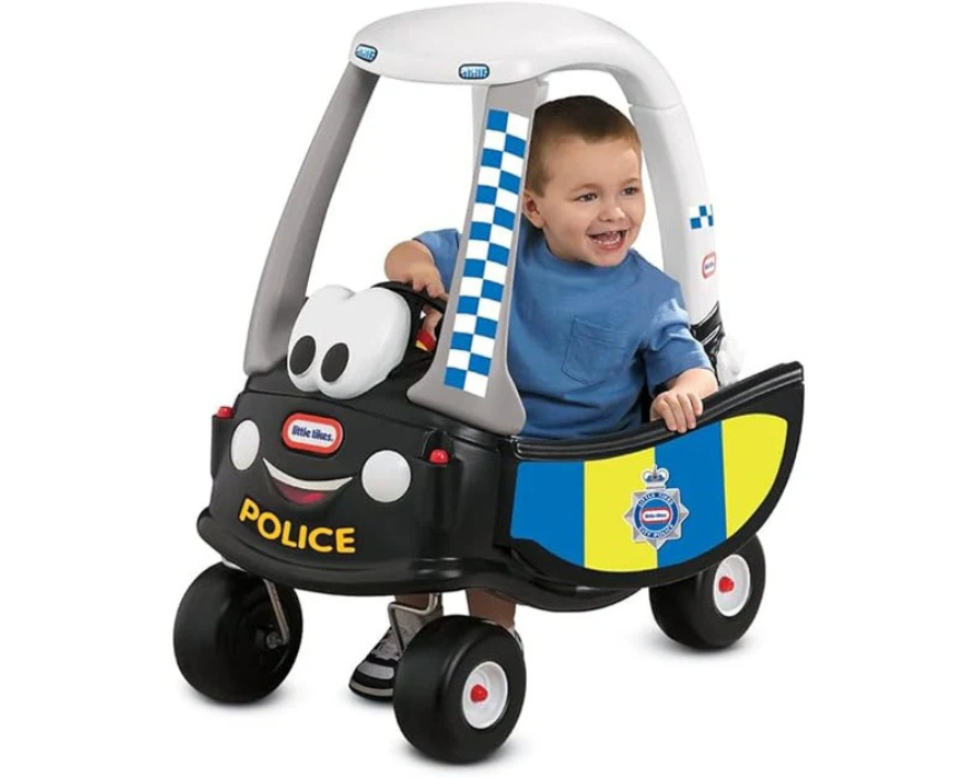 The Little Tikes Ride On Patrol Police Car is designed for toddlers, featuring a sturdy body, easy grip steering, and smooth rolling wheels for safe and enjoyable rides. Its playful police car design encourages imaginative role play while offering a comfortable seat, making it ideal for indoor and outdoor adventures paired with casual playtime outfits.