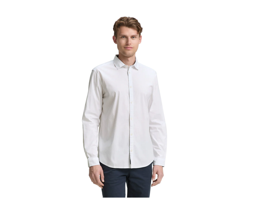 The Tom Tailor Regular Fit White Shirt with Stretch features a crisp white color, regular fit, and stretch fabric for comfort and ease of movement. Designed for everyday wear or smart occasions, it provides a clean, polished silhouette. It can be styled with tailored trousers for a formal look or paired with chinos for a refined casual outfit.