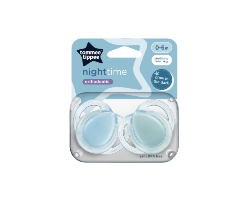 The Tommee Tippee Night Time Orthodontic Soother (0–6 months) is a glow-in-the-dark pacifier designed to help soothe and comfort babies during nighttime. Its orthodontic shape supports natural oral development while making it easy to find in the dark.