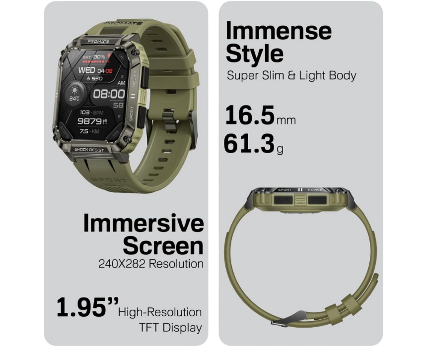 The Tough Built Smartwatch MNG Watch S19 in midnight green features a durable design with Bluetooth calling support, offering hands free communication and everyday smart functionality. Its bold yet refined color pairs well with casual wear, outdoor outfits, or active looks, making it a reliable choice for users who want both style and toughness in daily use.