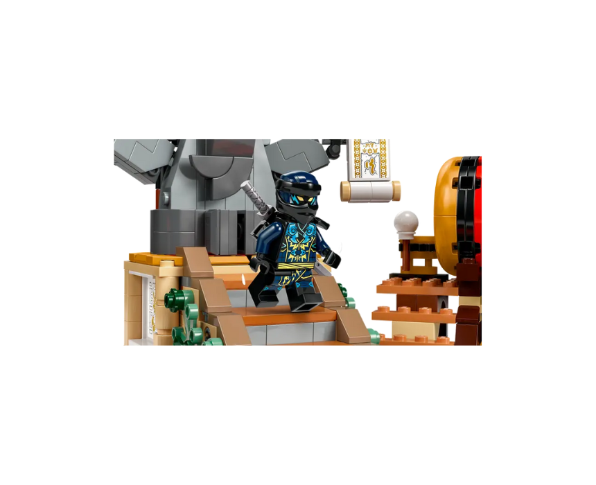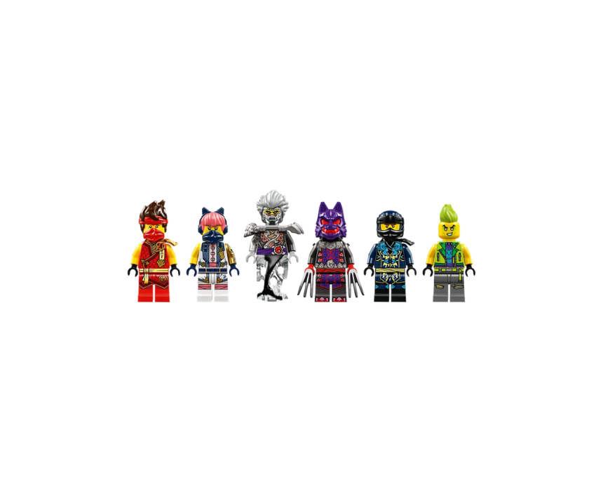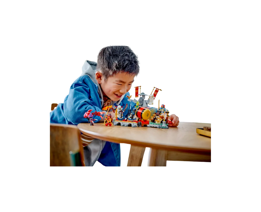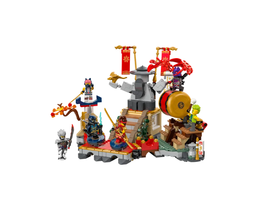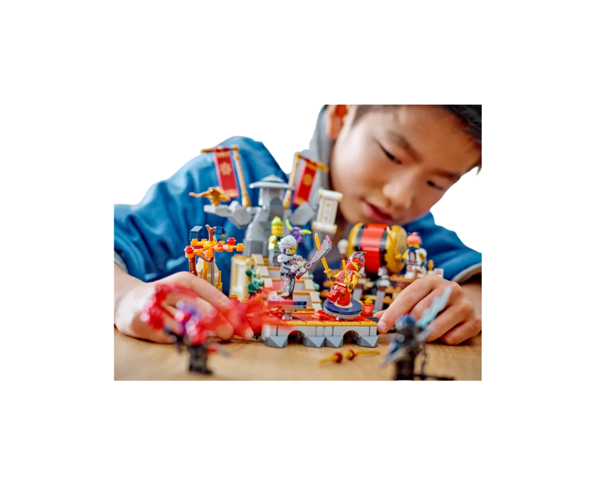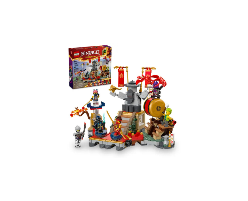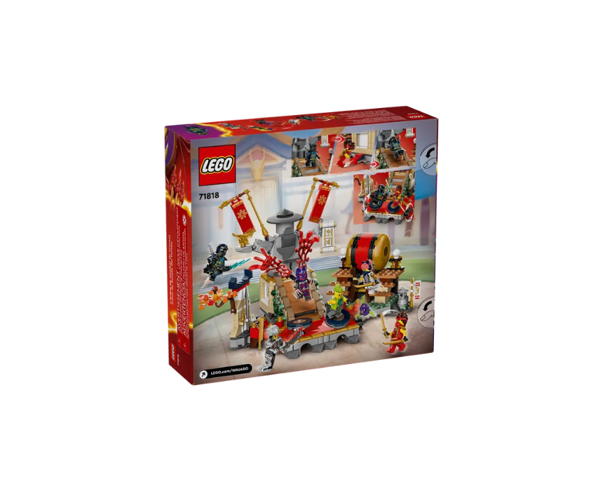 The LEGO NINJAGO Tournament Battle Arena 71818 is a 659 piece interactive battle set for ages 7+, inspired by season 2 of NINJAGO Dragons Rising and featuring moving platforms, a rolling drum, and collapsing stairs for action packed play. It includes 6 minifigures with Kai, Sora, Cinder, a Wolf Mask Warrior, and exclusive Evil Jay and Tox for epic ninja battles. After play, it can be styled as a striking display on a shelf or bedside table.