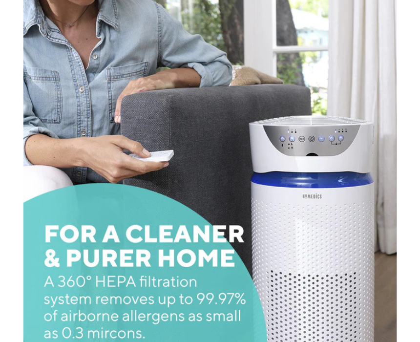 The HoMedics air purifier is designed for large rooms and delivers cleaner air with a pre filter for larger particles, five airflow speeds, whisper quiet operation, auto mode with particle sensing, a 12 hour timer, essential oil aroma tray, night light, remote control, and a replace filter indicator. It provides efficient purification for spaces up to 151 m² and can be placed in a corner or near the main airflow path for optimal circulation.