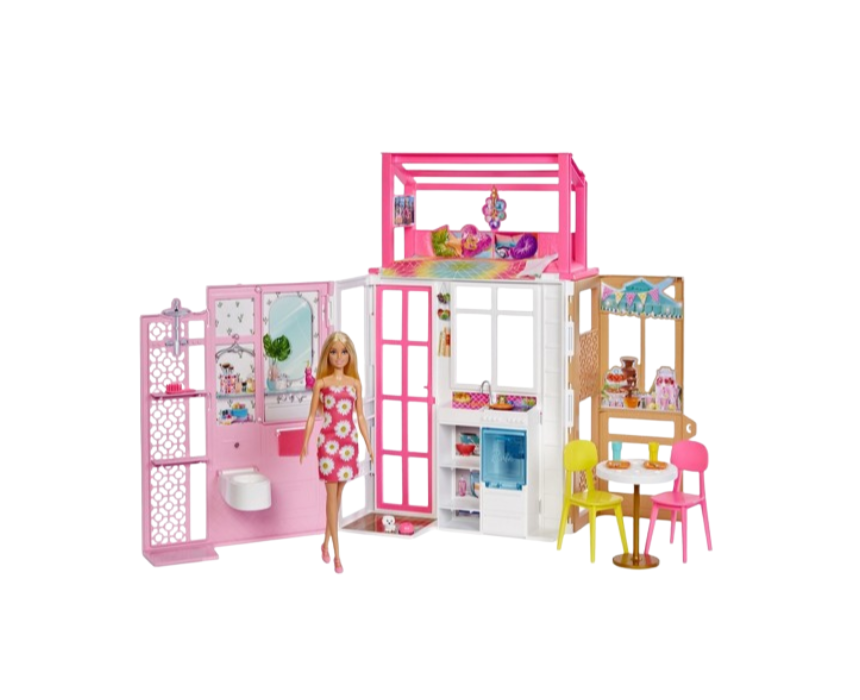 The fully furnished Barbie house features two levels, four play areas, and a 360-degree design, including a loft bed, wet room, kitchen, and dining area, all adorned with signature Barbie elements. The set comes with furniture, accessories, an adorable puppy, and a Barbie doll in a daisy-print dress, offering endless imaginative storytelling, while folding up easily for storage or travel.