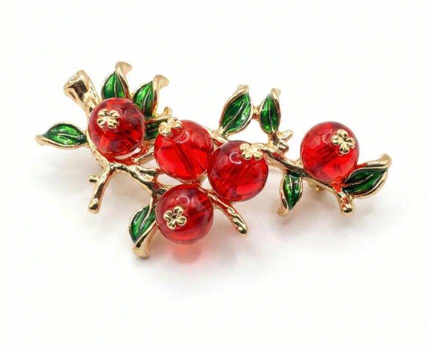 This translucent red berry branch brooch features a polished gold tone finish that highlights its delicate and vibrant design. Versatile and stylish, it can be pinned on jackets, dresses, scarves, or handbags to add a playful yet elegant accent. A charming accessory that enhances both casual looks and special occasion outfits.