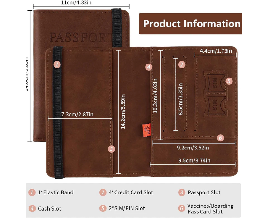 This travel wallet keeps your essentials organized with 1 passport slot, 4 card slots, compartments for tickets, cash, and 2 SIM cards. Featuring built-in RFID protection and a secure strap, it ensures safe, worry-free travel. Its slim, compact design fits easily in purses, backpacks, or carry-on bags for effortless organization on the go.