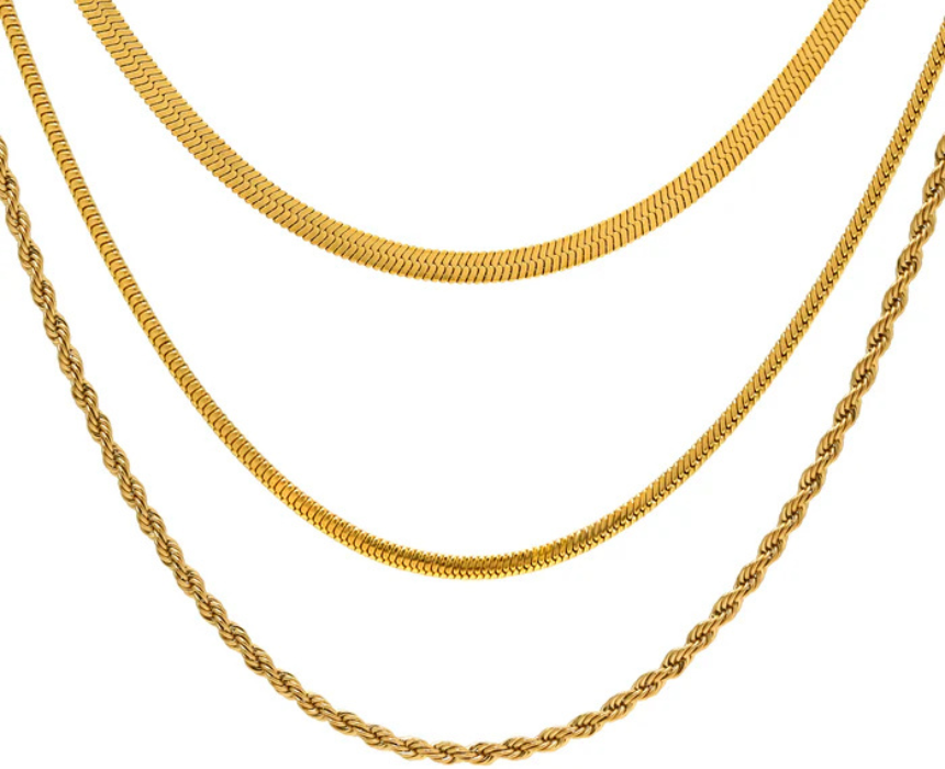 3 Necklaces Set Trendy Timeless Gold Essentials features a coordinated trio of necklaces designed to deliver a versatile and layered aesthetic for everyday styling. Each piece can be worn individually for a subtle look or combined to create a balanced stacked effect that complements both casual and dressy outfits. Style them together for a modern layered appearance or mix with other jewelry to personalize your ensemble.