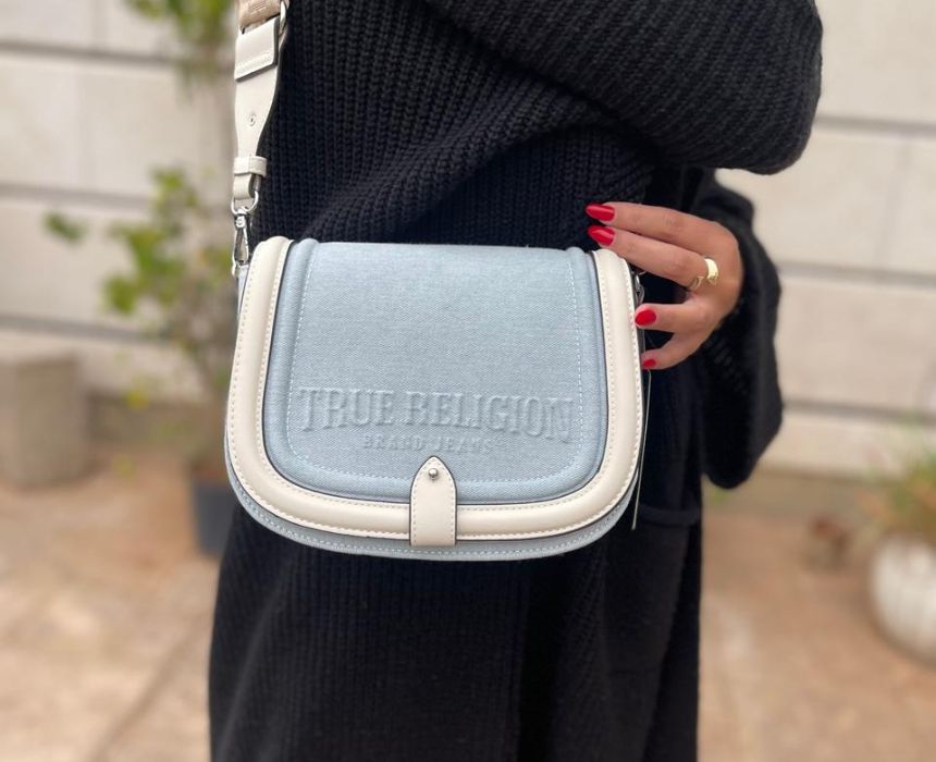 The True Religion Distressed Logo Denim Saddle Bag in light blue combines edgy denim style with practical design. Measuring 7.5 inches high, 2.2 inches wide, and 9 inches deep, it features a detachable and adjustable strap with a 12.5-inch shoulder drop for versatile crossbody or shoulder wear. With multiple interior pockets and a magnetic snap closure, this lightweight bag is perfect for elevating casual and day-to-night outfits with a cool, effortless vibe.
