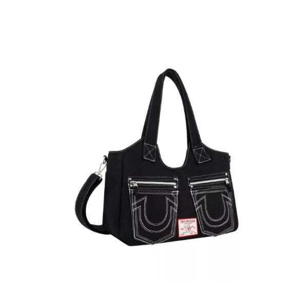 The True Religion Hobo Bag is a stylish women’s tote made from durable lightweight denim with silver-tone hardware and a spacious zippered main compartment. Featuring an adjustable shoulder strap with a 7 to 19 inch drop and a convenient front pocket with the iconic Buddha logo, it offers secure storage for essentials like phone, keys, and makeup. Perfect for casual outings, this versatile bag pairs effortlessly with jeans or a summer dress for a chic, modern look.