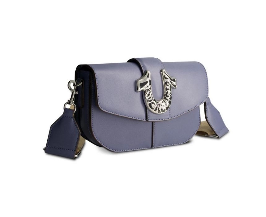 The True Religion Shoulder Bag in Blue features a bold horseshoe logo and a structured flap design with gold hardware for a polished look. Its adjustable and removable 16 to 28.5-inch shoulder strap offers versatile wear as a shoulder or crossbody bag. With a secure magnetic snap closure, polyester lining, and multiple pockets inside and out, it combines practicality with style, perfect for casual outings or elevating everyday wear. The 10″W x 6.5″H x 3″D size makes it compact yet spacious enough for essentials.