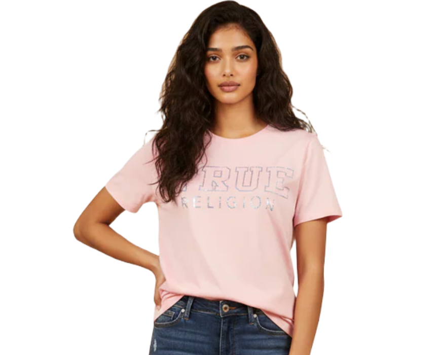 This True Religion T-shirt in Pink offers a casual, stylish look perfect for everyday wear. Crafted with a comfortable fit and classic short sleeves, it pairs effortlessly with jeans, shorts, or skirts. Style it alone for a simple outfit or layer under jackets and cardigans for a versatile, modern look.