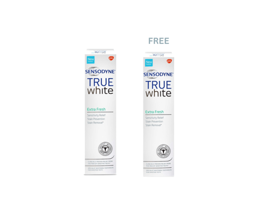 Sensodyne True White Extra Fresh Toothpaste is specially formulated for sensitive teeth, combining gentle whitening with daily cavity protection. Its low-abrasion formula helps restore your teeth’s natural color while relieving sensitivity pain. Enriched with fluoride, it protects against cavities and leaves a refreshing minty flavor for a clean, bright smile. Clinically proven for twice-daily use, it’s ideal for adults seeking comfort, freshness, and effective stain removal in one toothpaste.