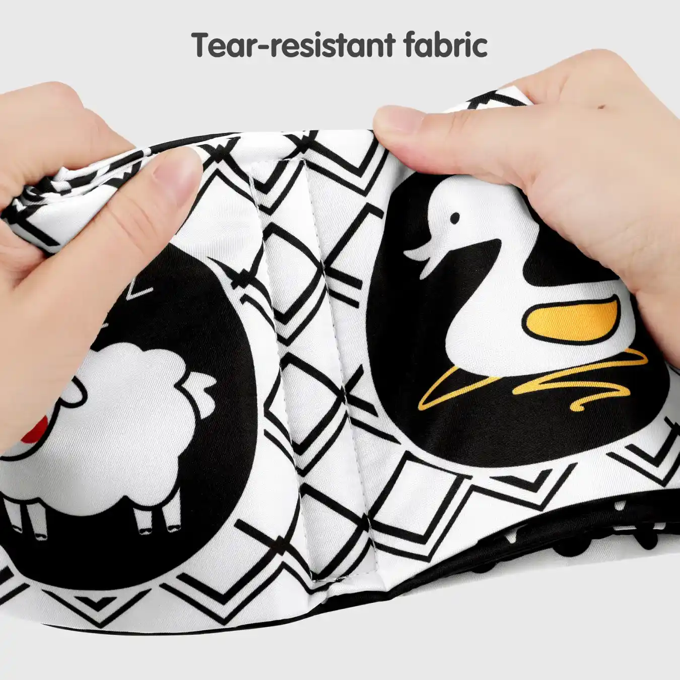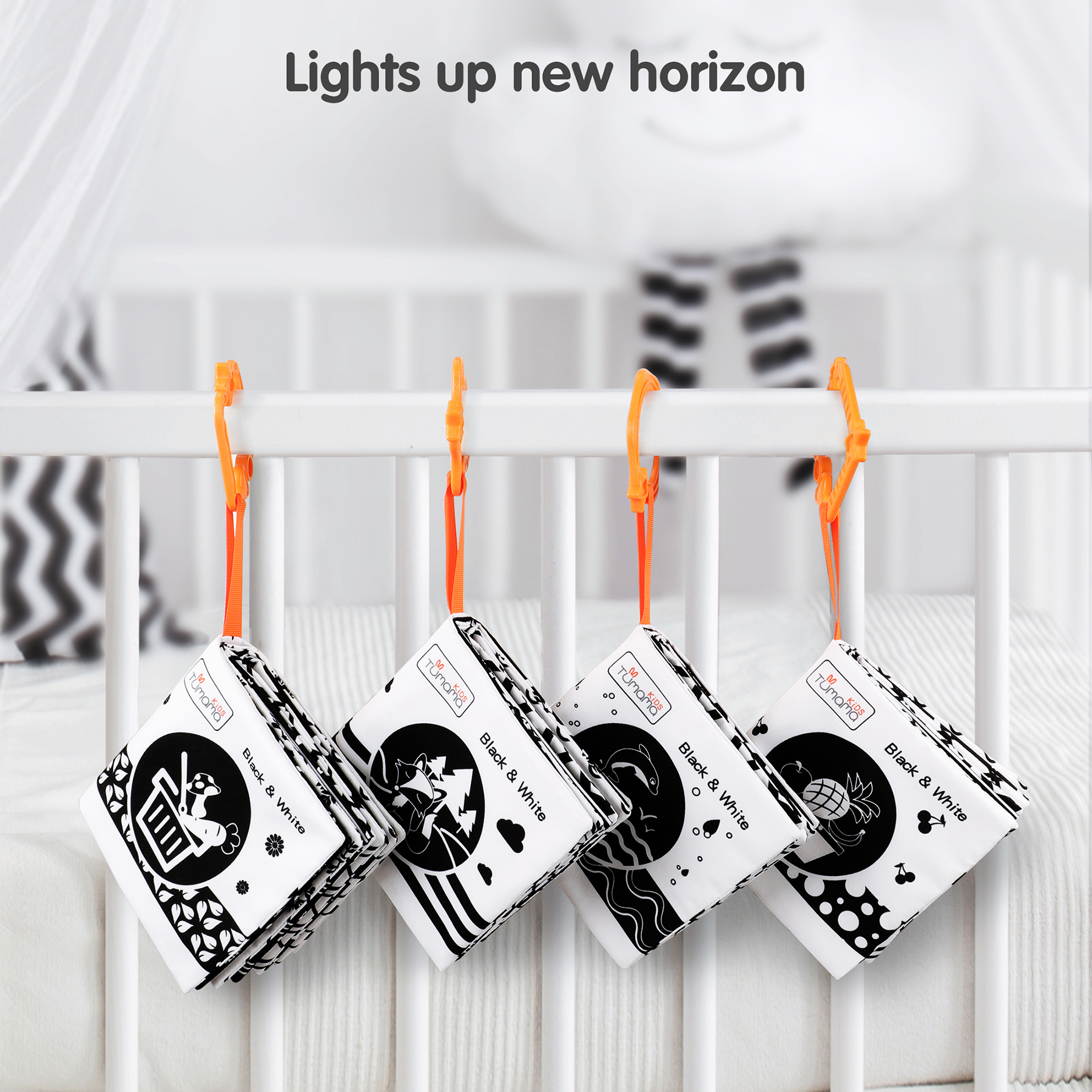 The Black, White and Single-Color Design Baby Cloth Book is specially created to stimulate newborn vision through high-contrast images and simple cognitive patterns featuring animals, fruits, and vegetables. Made from safe bamboo fiber fabric with soft rattling sounds and four hanging hooks, it’s perfect for cribs, strollers, or tummy time. Portable, hand-washable, and gentle for teething babies, this sensory book is ideal for bonding and early skill development. Recommended for newborns and up.