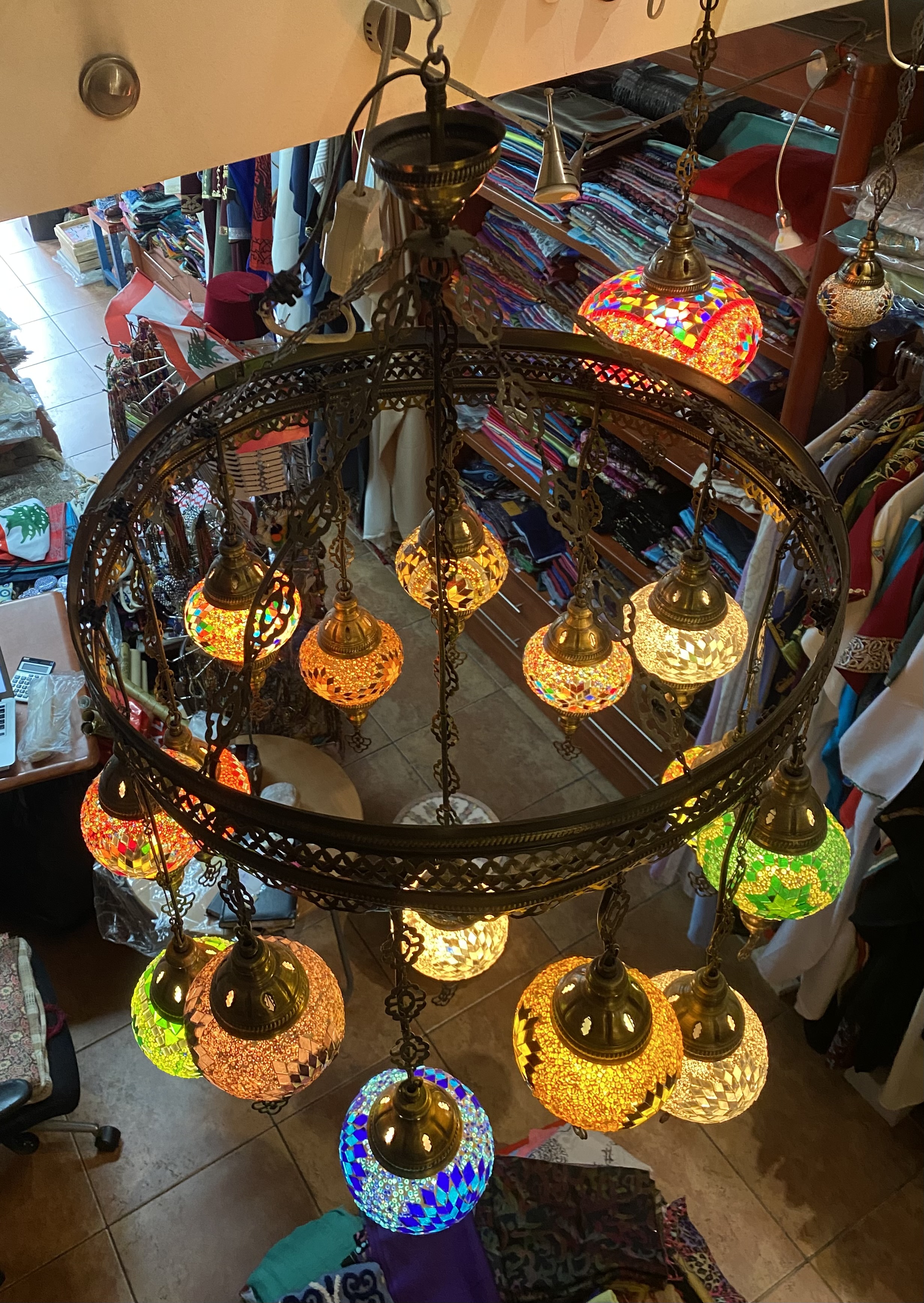 Make a bold statement with this breathtaking ceiling fixture featuring 15 authentic Turkish lamps. This multi-colored masterpiece creates a vibrant mosaic of light, perfect for adding a luxurious, bohemian touch to a large room.