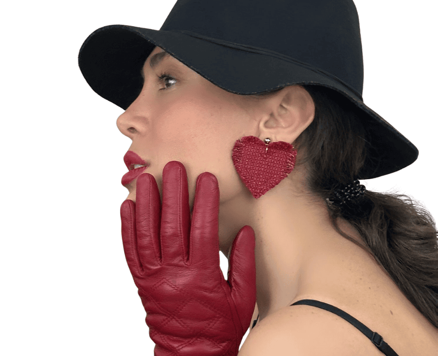 Tweed Heart Earrings are bold, romantic statement pieces crafted from vibrant red tweed fabric with delicate golden frost detailing. Their heart-shaped design adds texture, warmth, and elegance, making them perfect for Valentine’s Day or whenever you want to add a touch of love and sophistication to your look.