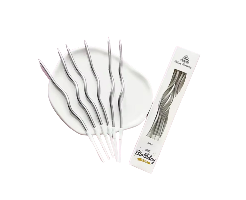 The Twisty Silver Candle Pack of 6 pcs, 20 cm, adds a sparkling and elegant touch to cakes and desserts for any celebration. Perfect for birthdays, parties, or special occasions, these candles create a visually striking centerpiece. Easy to use and festive, they bring a touch of glamour and fun to every event.