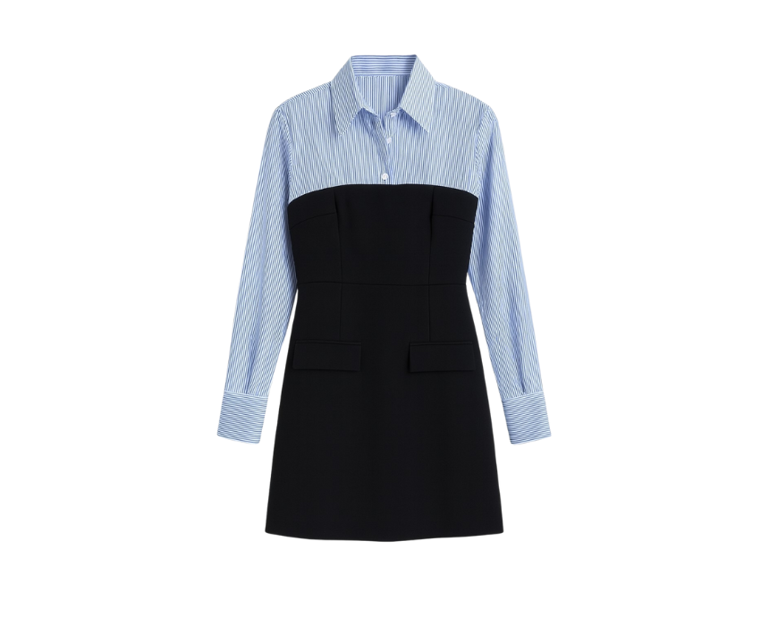 Elegant two-tone mini dress combining a classic striped shirt top with a sleek black structured bottom. Perfect for office, outings, or smart casual looks. Available in S-L.