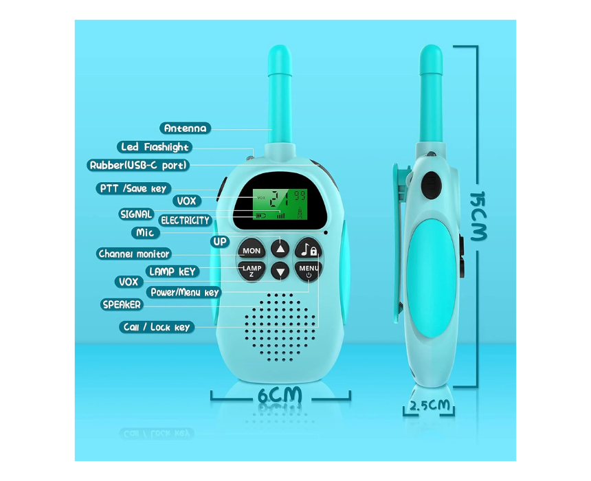 These rechargeable walkie talkies feature a 1200mAh AA battery with Android USB fast charging, providing long lasting power and convenience via computers, car chargers or power banks. Designed for children and adults, they offer hands free iVOX, multi channel communication, energy saving mode, low battery alert and a durable ABS build with safety features. With a range up to 6 km in open areas and 8 channels with 121 privacy codes, they are perfect for family outdoor activities, holidays and gifts for kids aged 3 to 11 years.
