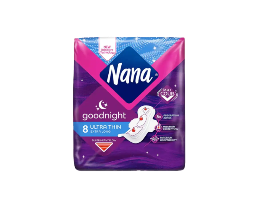 Nana Ultra Thin Goodnight pads provide overnight protection with extended length and a highly absorbent core to prevent leaks while you sleep. Their ultra-thin design offers comfort without bulk, and the soft top layer keeps skin gentle and dry. The flexible shape adapts to the body for a secure fit, ensuring you wake up feeling clean, dry, and confident.