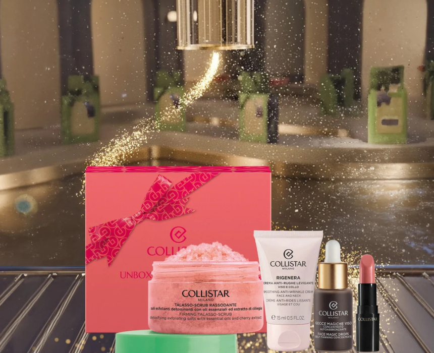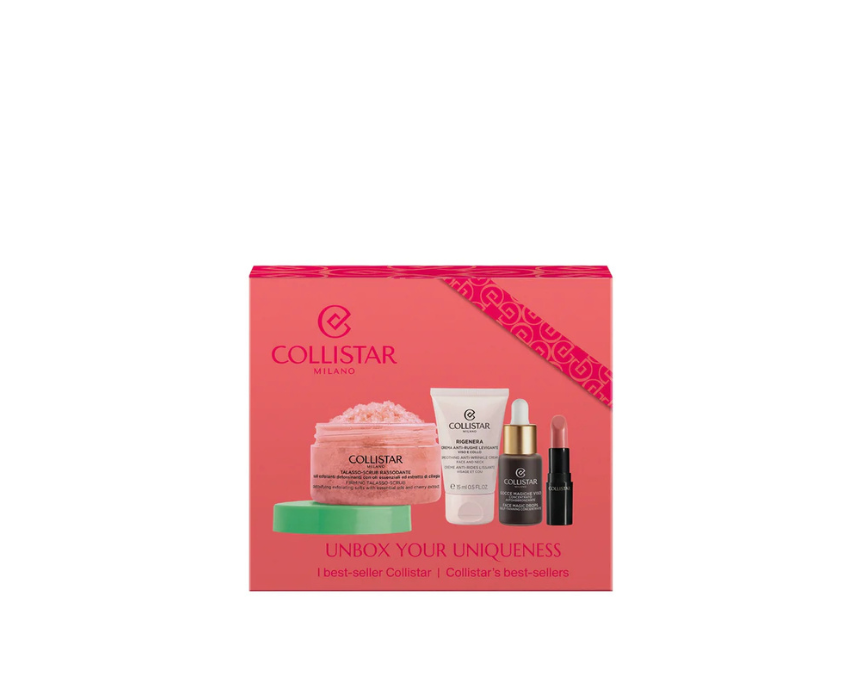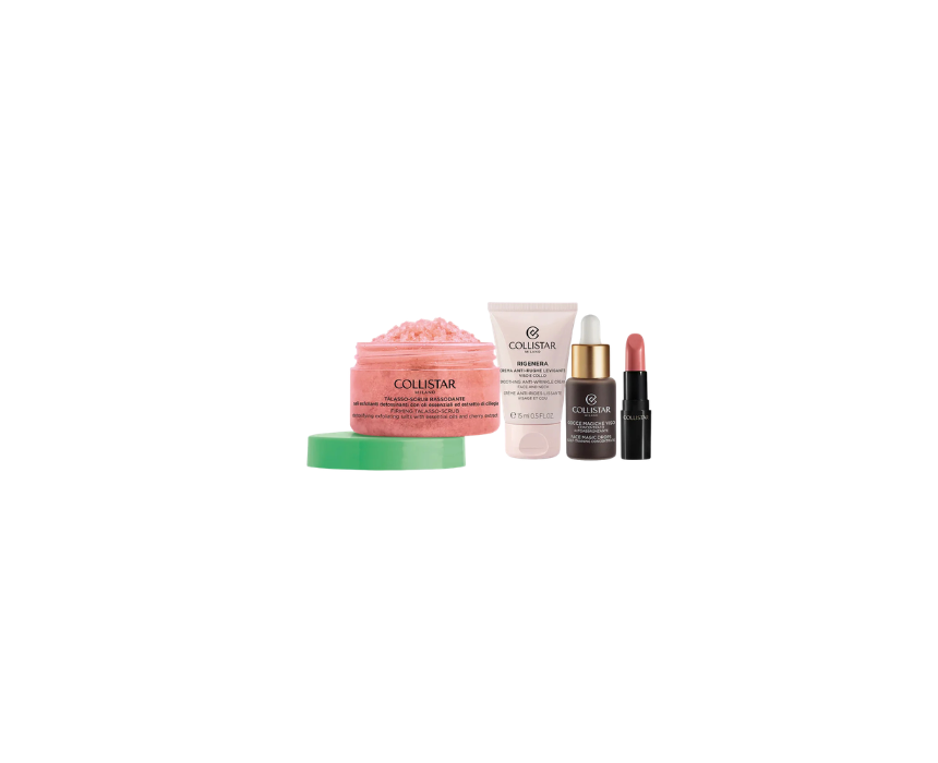 This Collistar beauty set includes Pure Lipstick 102 Antique Rose, Magic Face Drops 10ml, Regenerating Smoothing Anti Wrinkle Cream 15ml, and Firming Thalasso Scrub 70g. It combines makeup and skincare to hydrate, smooth wrinkles, enhance radiance, and deliver a natural sun kissed glow. Use the scrub, apply the cream and drops, then finish with lipstick for a complete glowing beauty routine.