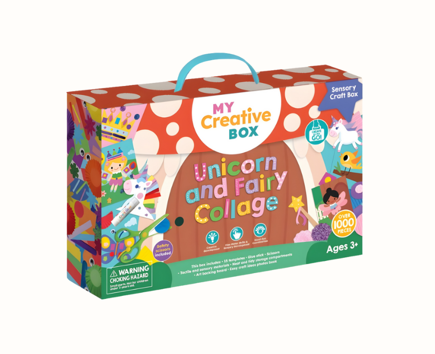 My Creative Box Fairy and Unicorn Creative Kit is suitable for ages 3 and up and includes over 1000 pieces packed in a sturdy portable carry case for mess free crafting. Children can create magical fairy and unicorn worlds using colorful papers, stickers, textures, templates, and a craft idea book with over 20 project ideas. Perfect for tabletop play, this kit boosts creativity, fine motor skills, and imaginative storytelling.