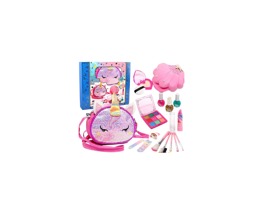 The Unicorn Washable Makeup Set for kids includes nail polish, eyeshadows, blush, brushes, and a unicorn purse designed for imaginative play and creative role-play. Made with safe, washable materials, it comes in a fun sequined unicorn-themed bag and can be lightly applied for dress-up play before being neatly stored back in the purse.