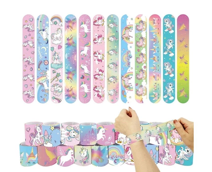 Add a burst of fun to your child’s day with this set of 4 unicorn slap bracelets, each featuring colorful random designs and magical unicorn prints that kids love. Easy to wear with a simple slap on the wrist, these playful accessories are perfect for party favors, gifts, or everyday dress-up fun, making them a must-have for every unicorn fan.