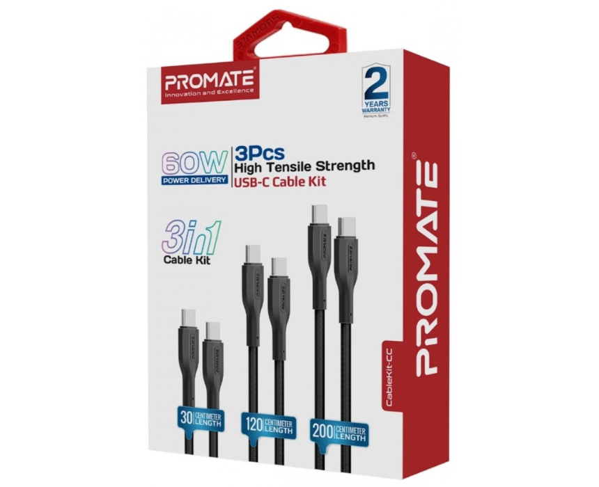 The USB-C Cable Kit 60W 3Pcs 3-in-1 Cable Kit Black Cablekit CC offers versatile charging and data transfer with three cables in one compact set. Its sleek black design supports fast 60W power delivery for smartphones, tablets, and laptops, making it perfect for home, office, or travel while keeping devices organized and powered efficiently.